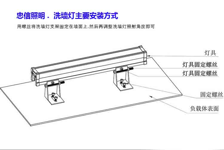一:根據燈具、電源的所放置的位置來做好安裝前工作;安裝時調整好洗墻燈的照射角度,用螺絲將燈具固定牢靠(詳見下面的示意圖);