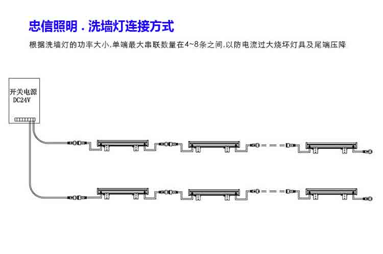 二:將燈具與電源線連接牢固,不用的線頭用防水膠帶包好;在安裝接線時洗墻燈串聯數量保持在5~6條左右,以防串聯較多時后端壓降大(詳見下面的示意圖);